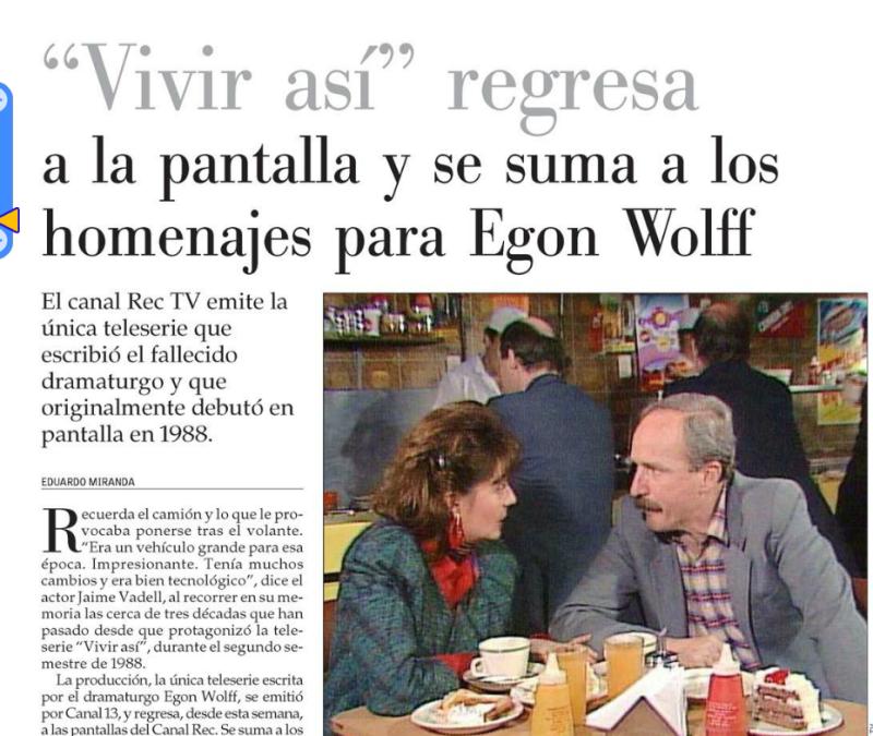 3-“Vivir así” regresa a la pantalla y se suma a los homenajes para Egon Wolff (El Mercurio)