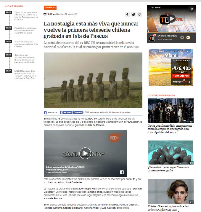 REC TV exhibe por sus pantallas la teleserie “Anakena” del año 1982. Ésta el la primera teleserie nacional grabada en Isla de Pascua con grandes protagonistas: Ramón Farías, Ana María Ramos, Patricia Guzmán, Patricio Achurra, entre otros.