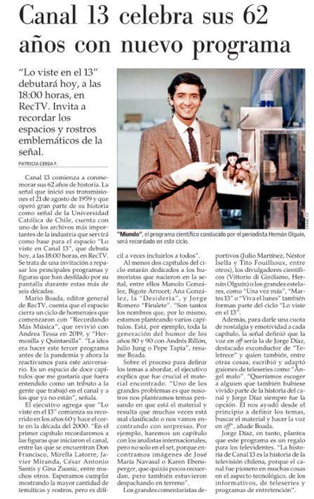 Con motivo de cumplirse un nuevo aniversario de la estación del angelito, REC estrena un ciclo especial de 12 programas, llamado “Lo Viste en el 13”, para rememorar los momentos y personajes más emblemáticos del canal, durante sus 62 años de existencia.